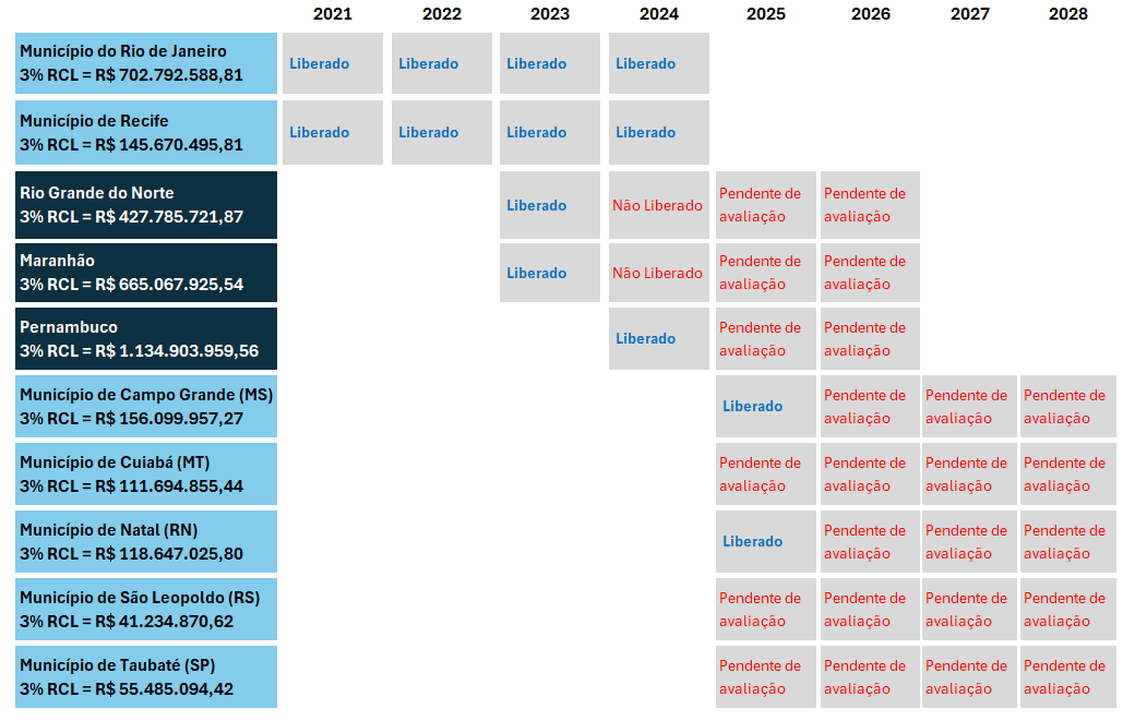 Quatro Estados – Amapá (AP), Rio Grande do Norte (RN), Maranhão (MA) e Pernambuco (PE) – e dois Municípios – Recife (PE) e Rio de Janeiro (RJ) – já aderiram ao PEF. O PEF do Amapá encerrou em dezembro de 2022. A primeira adesão do Rio Grande do Norte encerrou em dezembro de 2022, mas o Estado optou por aderir novamente em 2023. Os Planos dos Municípios do Rio de Janeiro e do Recife encerraram em dezembro de 2024.
